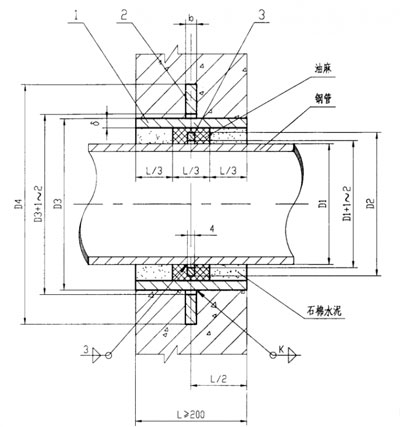 剛性防水套管適用于管道穿墻處不承受管道振動和伸縮變形的構(gòu)(建)筑物,A型適用于鋼管。從圖中可以看到套管的管材厚度為δ,套管的外徑為D3,所穿的鋼管的外徑為D1。對應(yīng)于A型剛性防水套管的各個(gè)部位的尺寸。舉個(gè)例子,DN50的A型剛性防水套管,它的外徑為D3=114,而能夠穿的鋼管的外徑為D1=60。再舉個(gè)例子,DN80的A型剛性防水套管,它的外徑為D3=140,而能夠穿的鋼管的外徑為D1=89。鋼管的公稱直徑與外徑的對照表,DN50的鋼管的外徑為57(B型),DN80的鋼管的外徑為89(B型)。(注:B型指國內(nèi)沿用系列<公制管>)